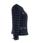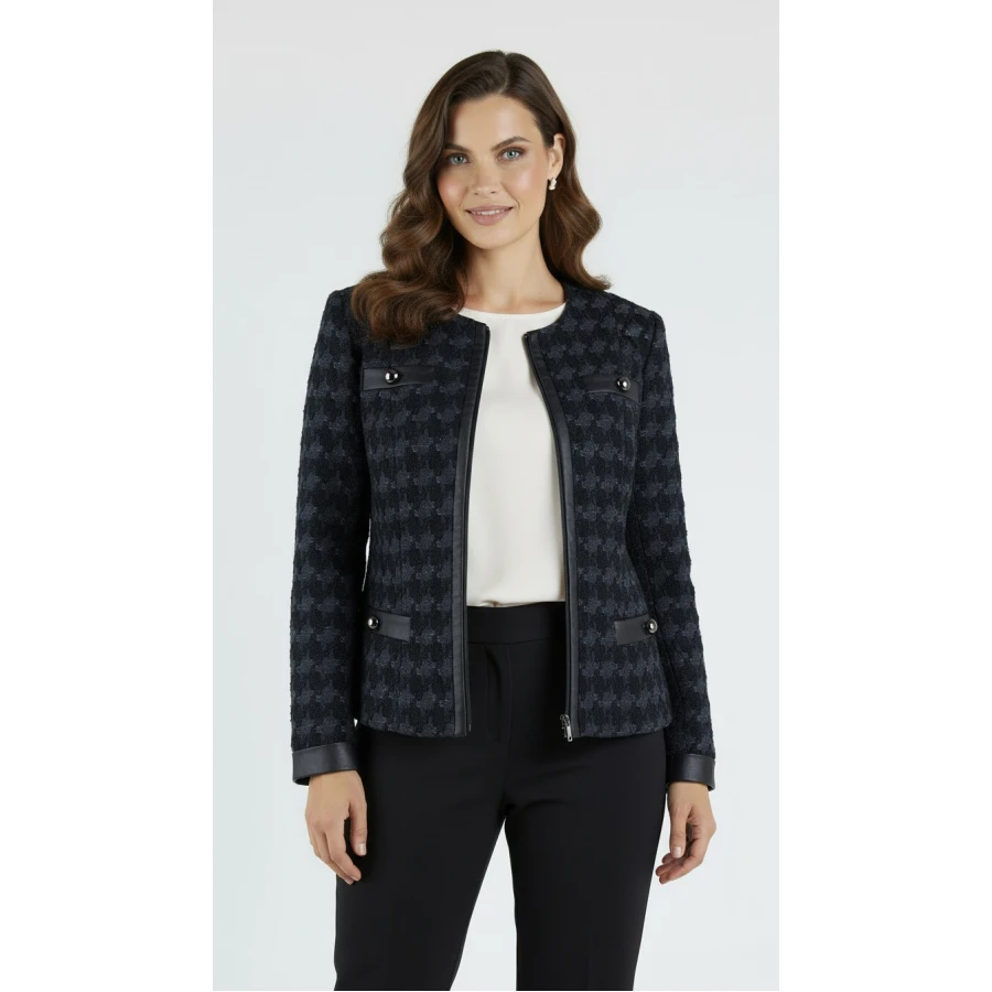 Това дамско сако съчетава стил и практичност с изискани детайли. Изработено от 80% памук, 15% полиестер и 5% еластан, то осигурява комфорт и удобство за ежедневна употреба или специални поводи. Черното сако с антрацитни акценти и кожени детайли промазка добавя модерен и елегантен завършек към вашия гардероб. Красивите декоративни копчета и закопчаването с цип подчертават уникалността на дизайна. Подплатено с еластичен хастар, сакото е идеално за зимния сезон и част от новата колекция Зима 24/25.