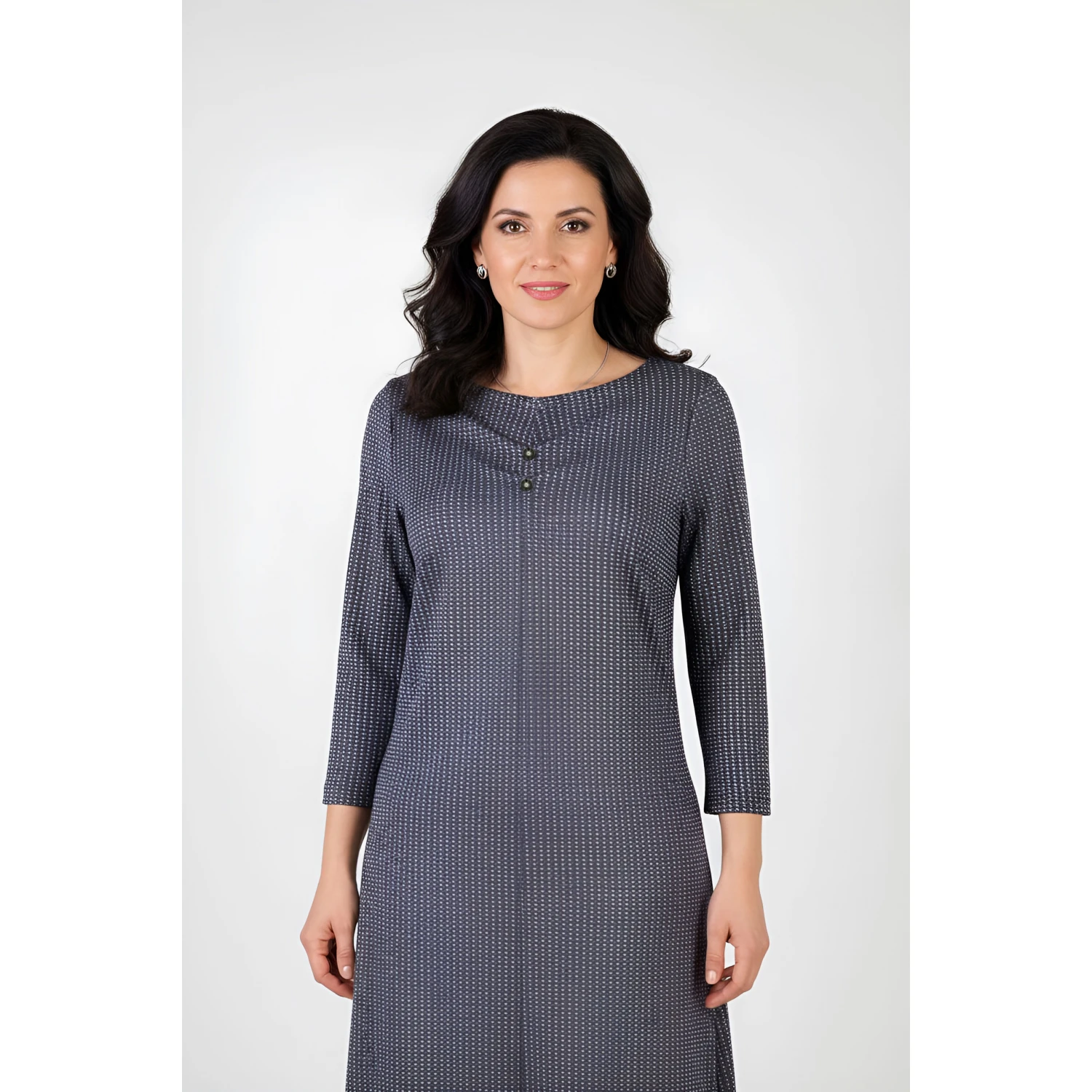 Моделът е леко разкроен, с 3/4 ръкави, а финият детайл с две чупки и декоративни аксесоари с малко камъче в зоната на деколтето придава деликатна елегантност.