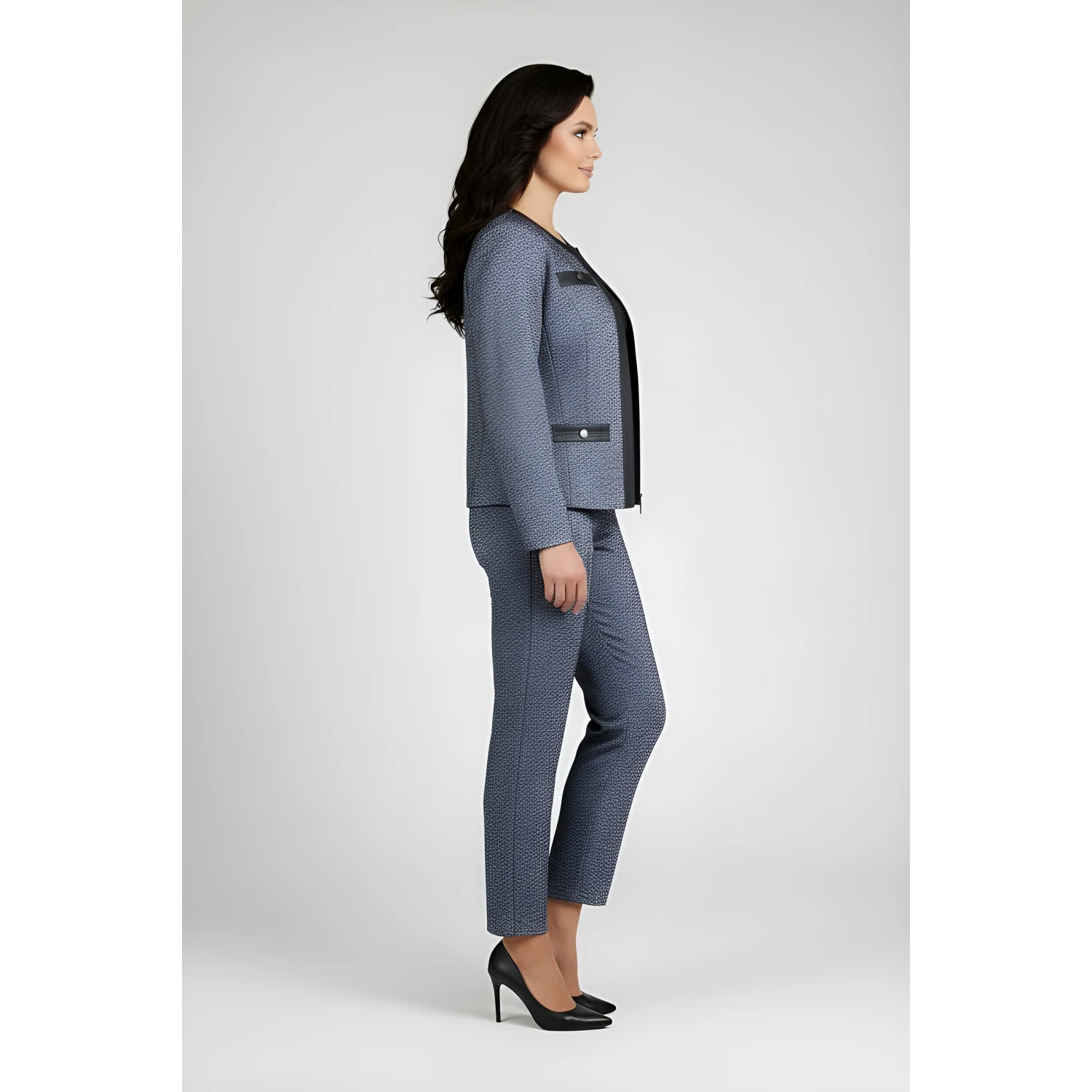 Това стилно дамско сако е перфектният баланс между елегантност и комфорт. Сивият меланж създава универсална визия, а кожените акценти и декоративните копчета придават модерен характер. Съставът от вълна и еластан гарантира топлина и лекота на движение, докато хастарът осигурява допълнителен комфорт. Подходящо за офис, специални поводи или ежедневно носене с класа. Идеално се съчетава с панталон от същата серия.
