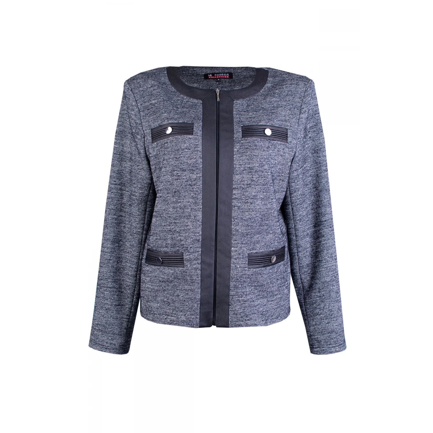 Стилно дамско сако в сив меланж, с кожени акценти и декоративни копчета – меко, топло и изискано.