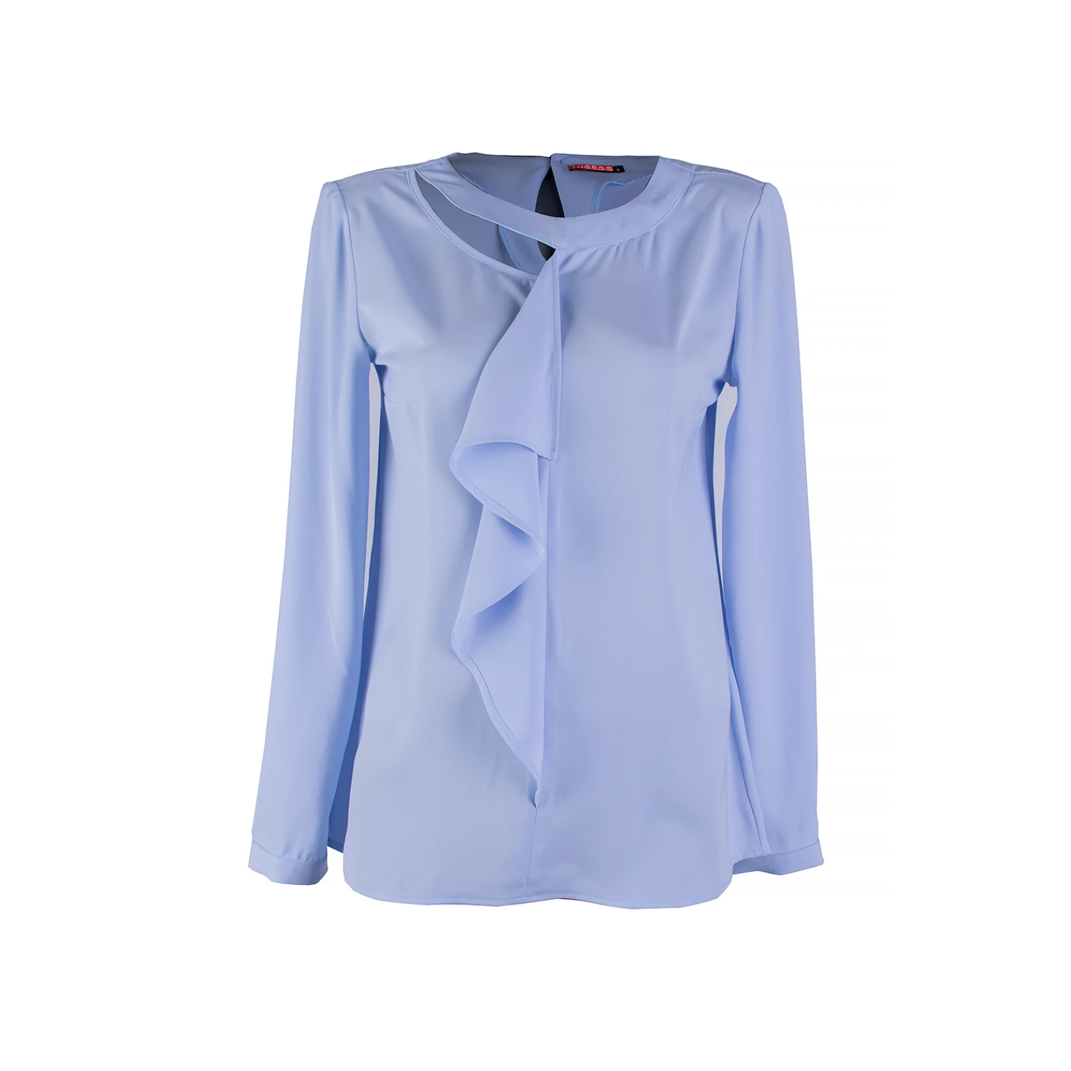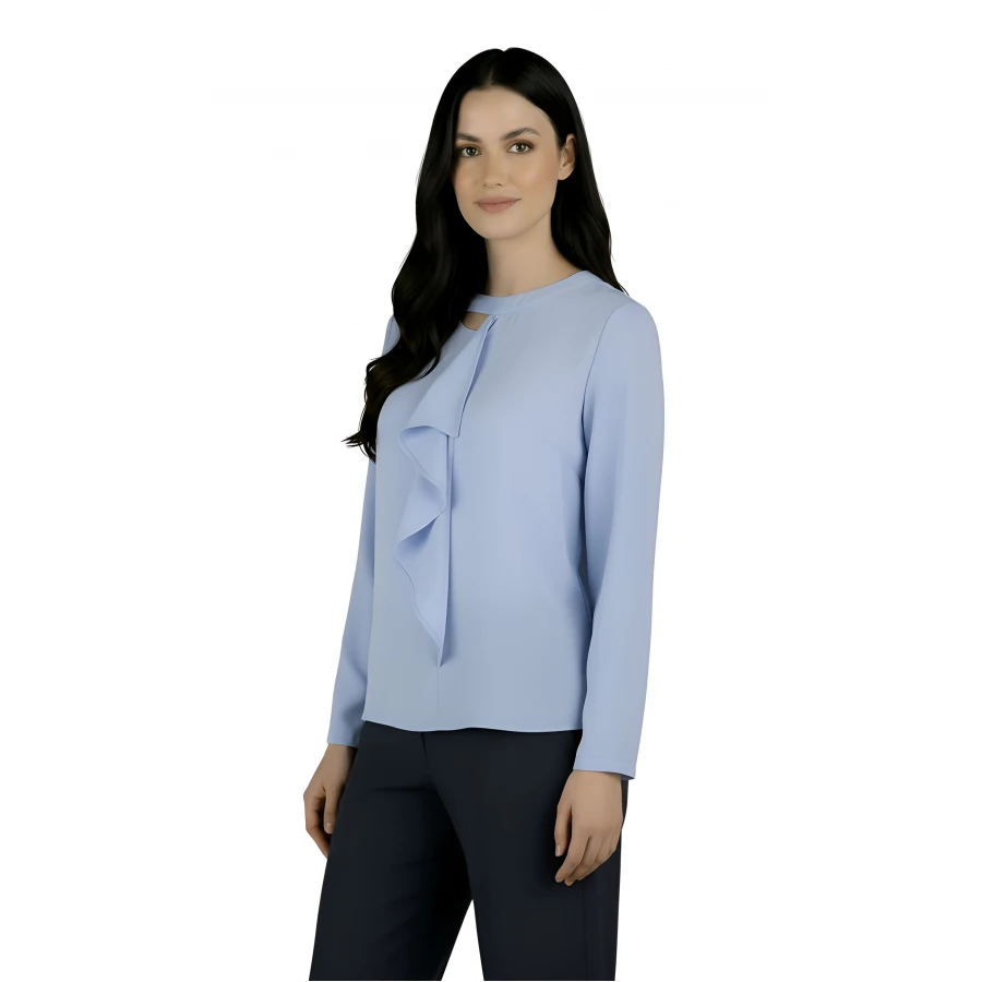 Тази ефирна дамска блуза в светло синьо е създадена за жени, които ценят комфорта и елегантността. Нежният ѝ допир и леката поливискон материя я правят идеален избор за топлите месеци. Воланът добавя романтичен акцент, а изрязаната детайлност около врата внася модерност в класическия силует. Част от новата колекция Пролет-Лято 2025, тази блуза е перфектен избор за стилни ежедневни и официални комбинации.