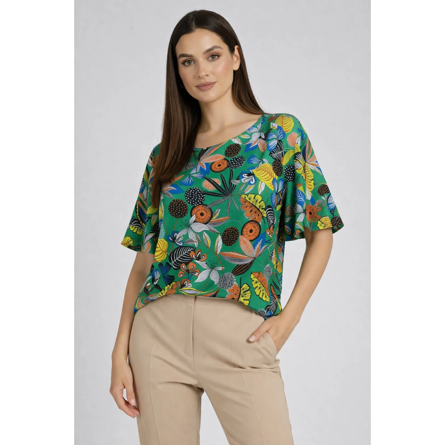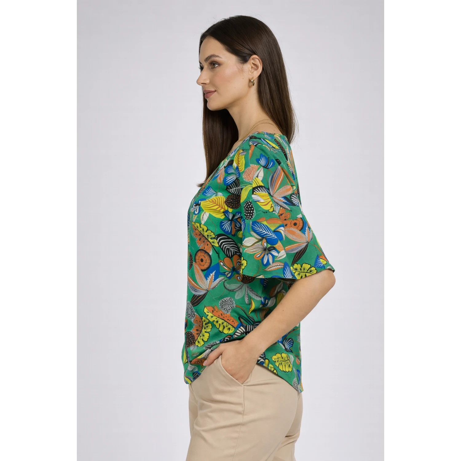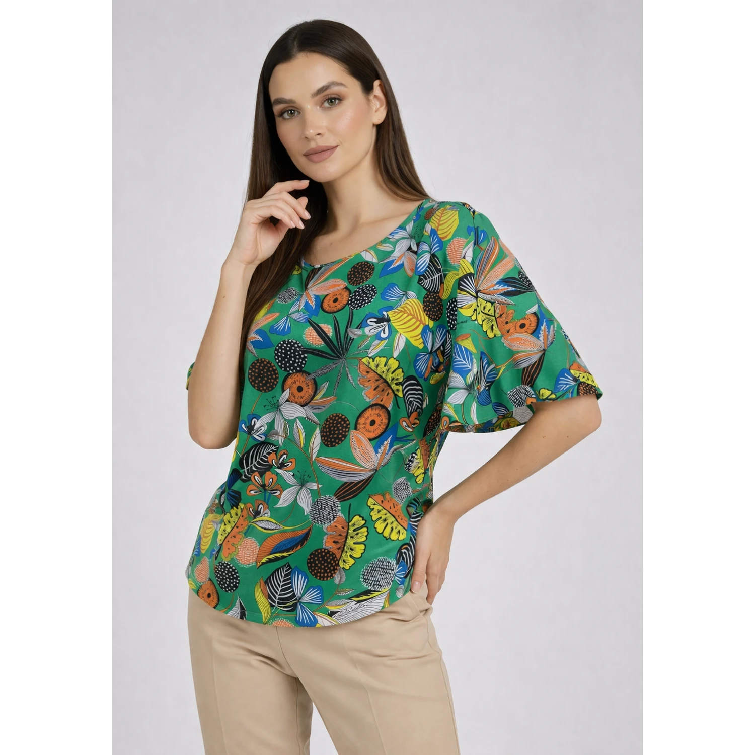 Лека, мека и изключително удобна дамска блуза с цветна щампа – перфектна за ежедневие, офис или разходки през топлите дни.