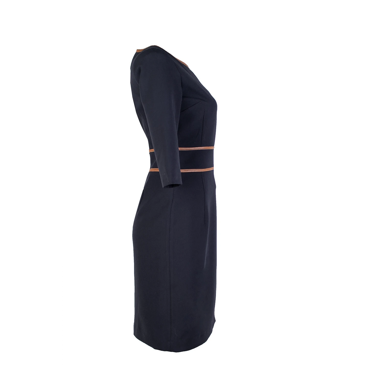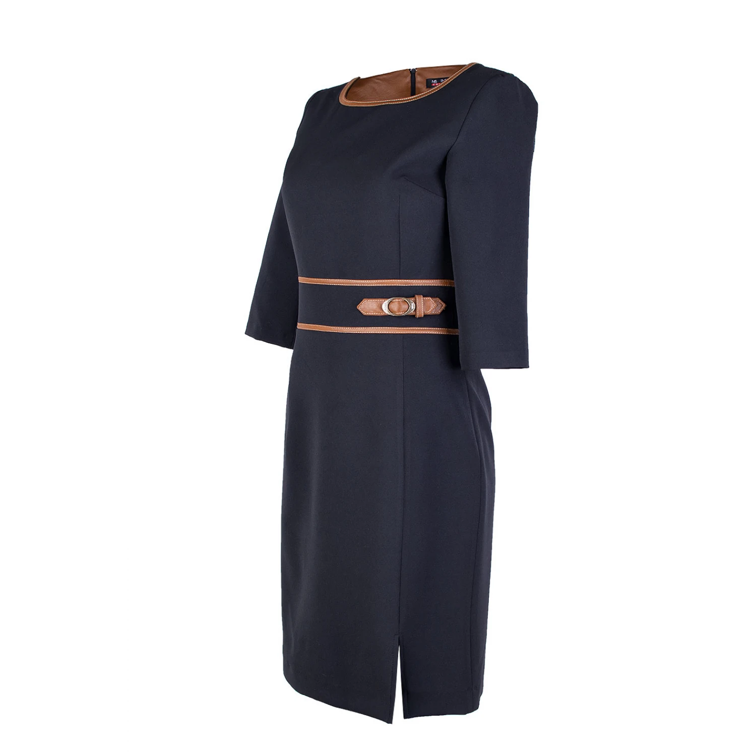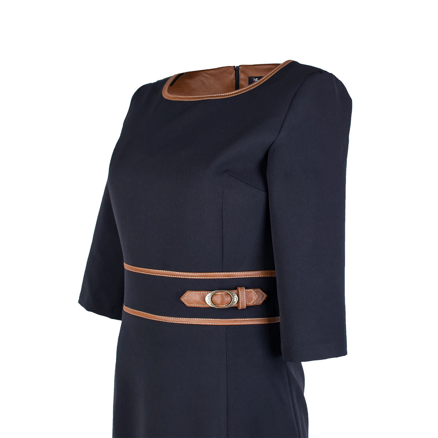 Акцентът е комбинацията от материя и декоративни детайли от кожа в нюанс camel около деколтето и колана, допълнен с метална катарама за елегантен завършек.