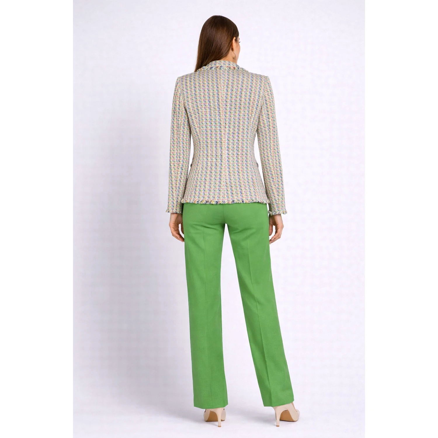 Панталонът е в свеж зелен цвят и е с широк крачол, което осигурява комфорт и стилна силуетна линия. Костюмът е отличен избор за офис, бизнес срещи и официални поводи.