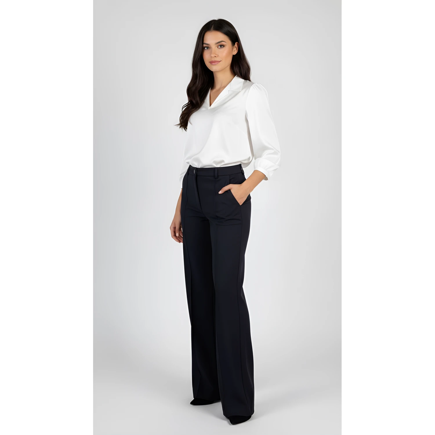 Класически дамски черен панталон с прав и широк крачол, създаден да осигурява комфорт и безупречна визия през сезон Есен – Зима 25/26.