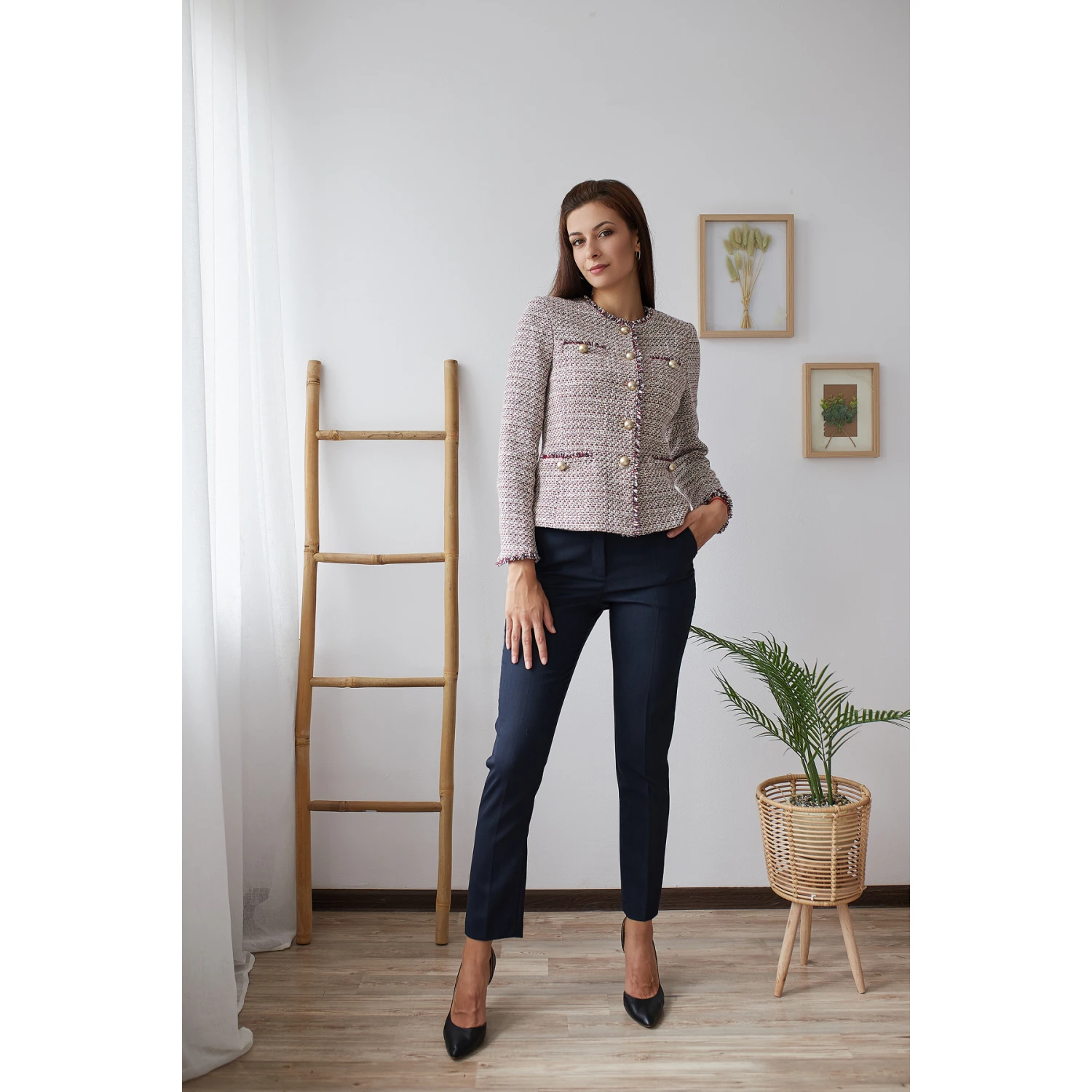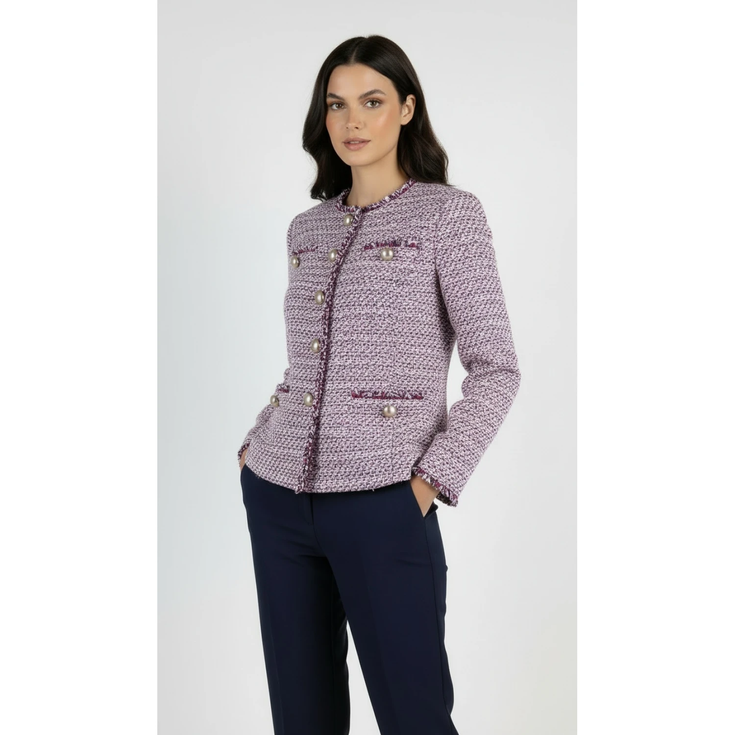 Елегантно сако от букле в екрю, тъмносиньо и червено с ламе, подходящо за делови и вечерни поводи. Закопчаване с метални копчета и яка около врата.
