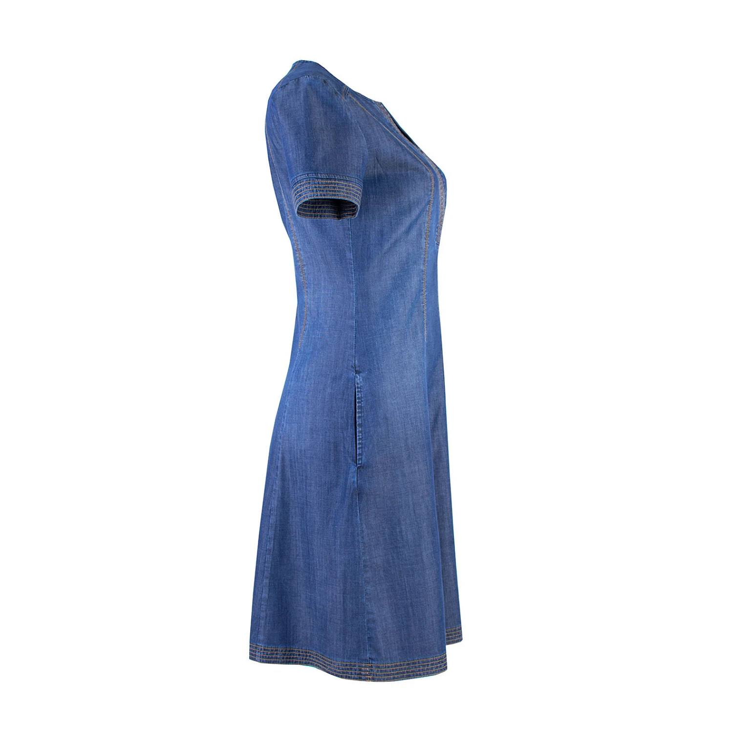 Изработена от висококачествен тенсел деним, тази рокля впечатлява с нежния си силует и декоративни шевове по ръкавите, деколтето и подгъва, както и джобовете встрани. Лека и ефирна, тя е перфектна за топлите месеци. Скритият цип на гърба осигурява удобство при обличане. Идеалният избор за жената, която търси комфорт и стил в едно.