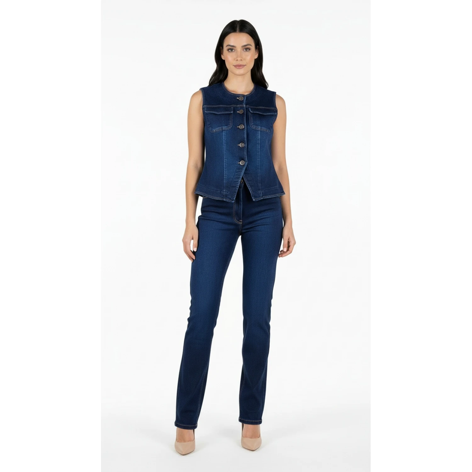Vă prezentăm blugi matlasați clasici de damă, de culoare albastru închis, parte a noii colecții Toamnă – Iarnă 25/26 și printre cele mai căutate modele de iarnă.