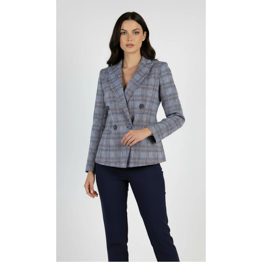 Jachetă de damă din lână cu carouri, gri și albastru. Potrivit pentru viața de zi cu zi și ocazii sofisticate. Se combină cu pantaloni și blugi.
