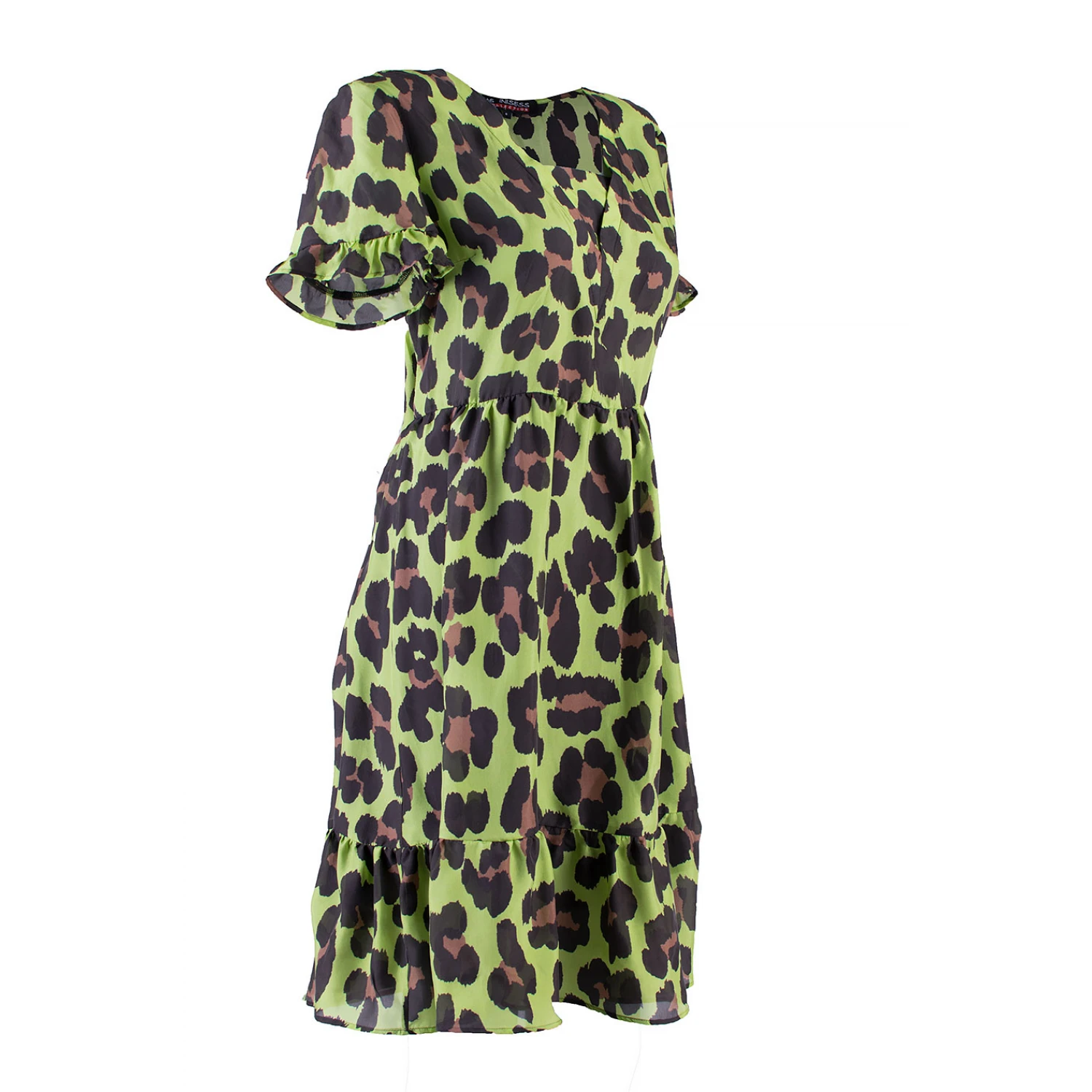 Întoarce capetele cu rochia noastră galbenă și verde cu imprimeu leopard. Cu talie elastică și volane, este alegerea perfectă pentru fiecare zi. Fabricat în Bulgaria din 65% mătase și 35% poliester.