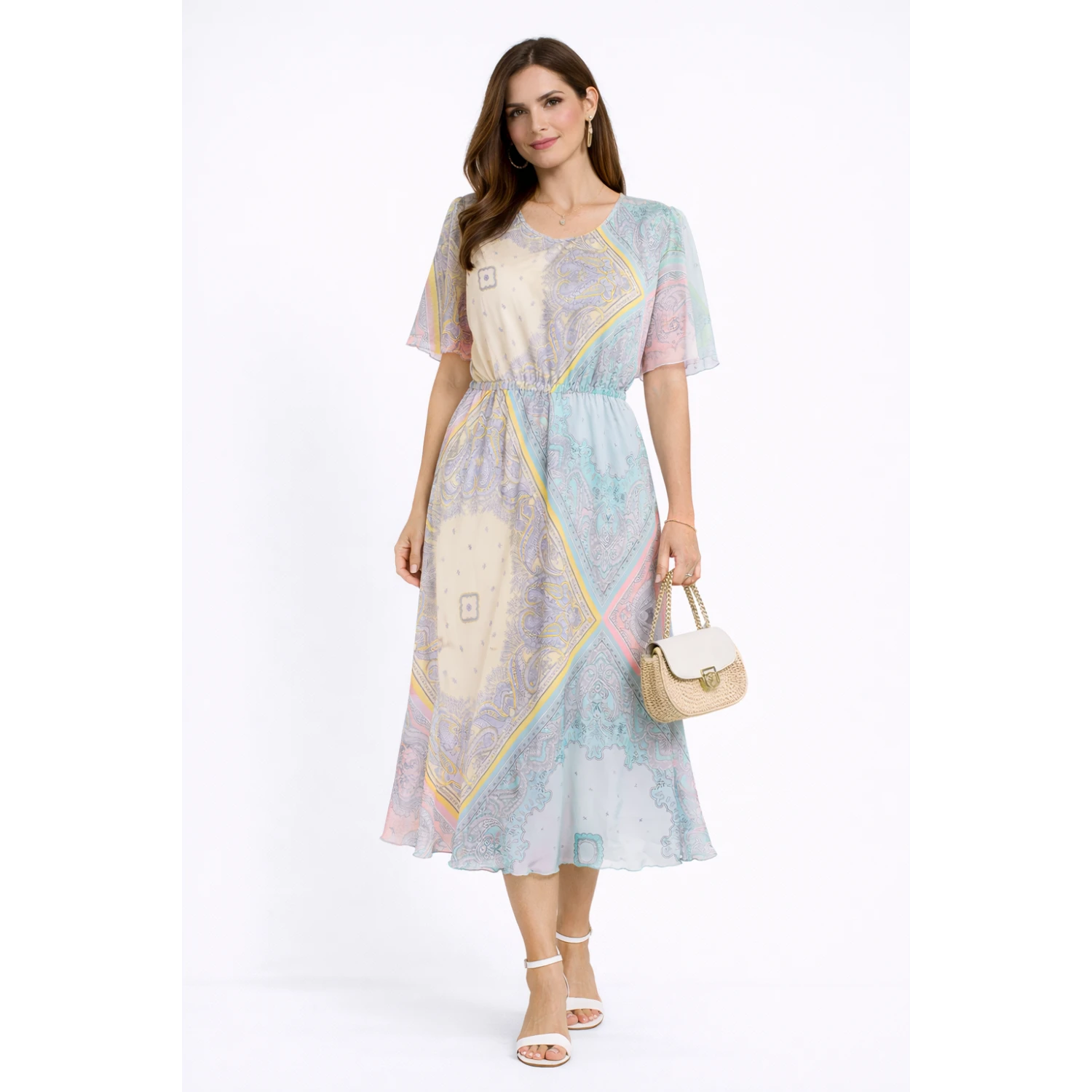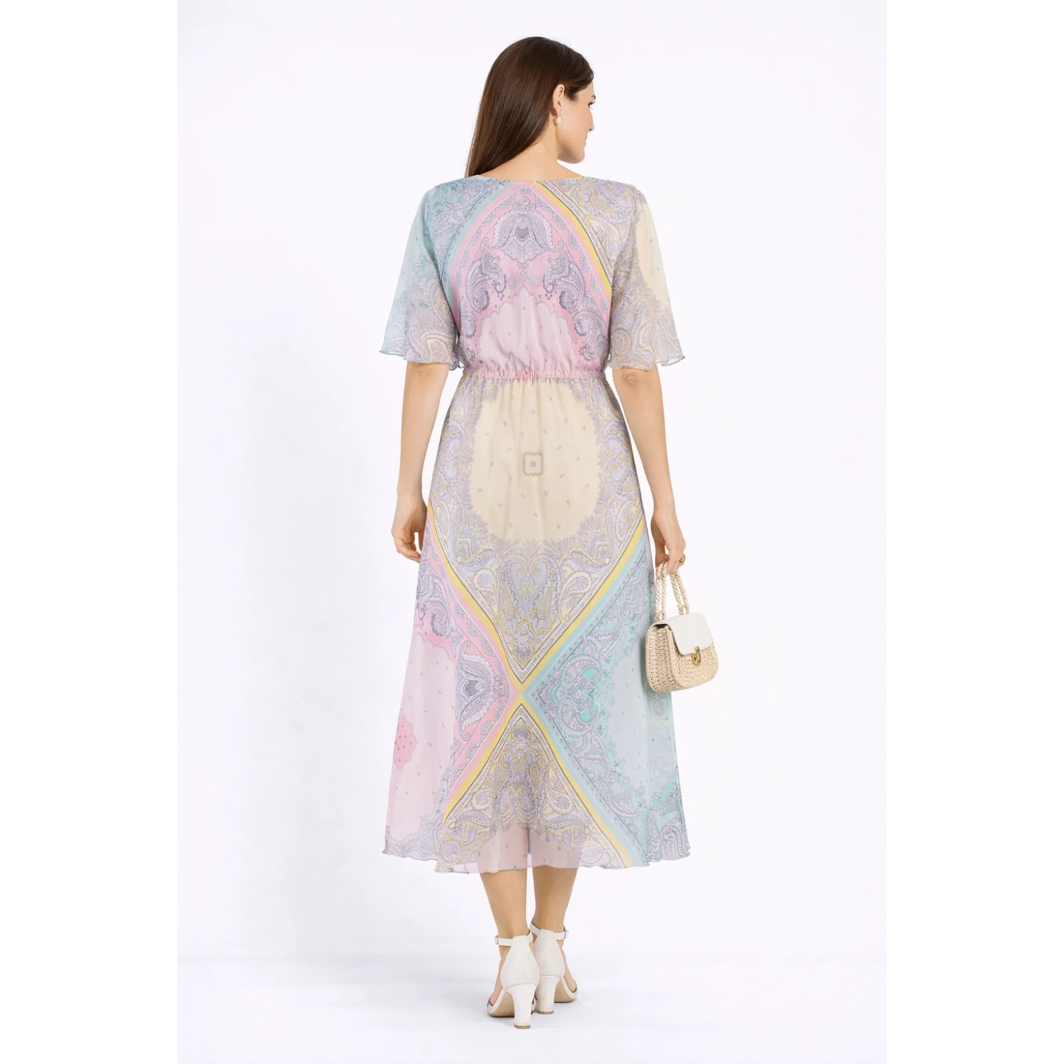 Rochie de damă din șifon lejeră și colorată, cu căptușeală și mâneci reglabile. Potrivit pentru purtarea de zi cu zi, fabricat 100% poliviscon. Confort și stil într-unul.