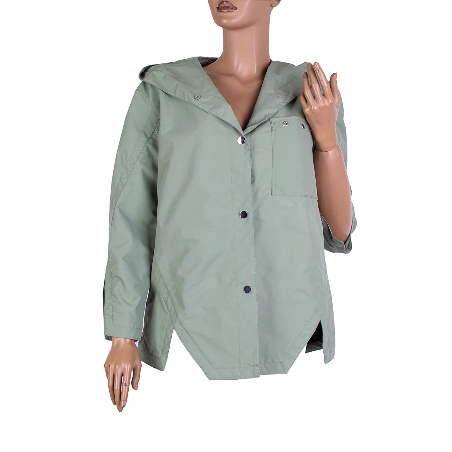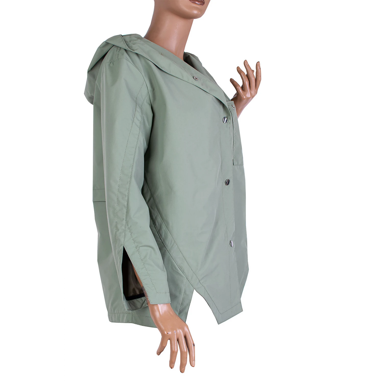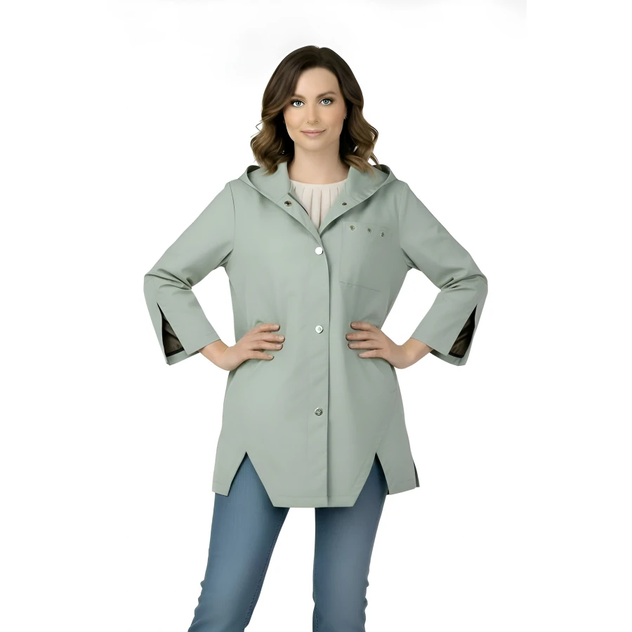 Дамско непромокаемо яке в свеж светло зелен цвят, изработено от 100% полиестер. Моделът е с асиметрични елементи, качулка и раздвижена линия, която придава модерна визия. Закопчава се с метални тик-так копчета и е с подплата за комфорт през по-хладните есенни дни. Идеално за ежедневието, разходки и спортно-елегантен стил. Българско производство с високо качество.