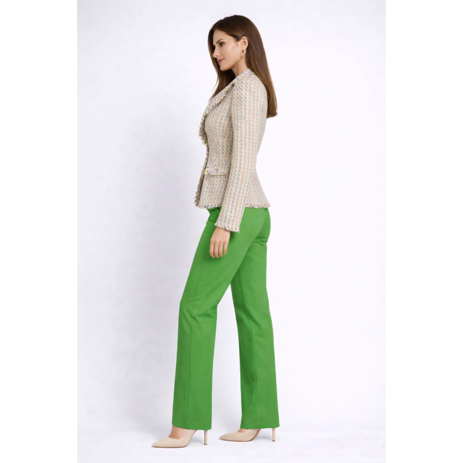 Панталонът е в свеж зелен цвят и е с широк крачол, което осигурява комфорт и стилна силуетна линия. Костюмът е отличен избор за офис, бизнес срещи и официални поводи.