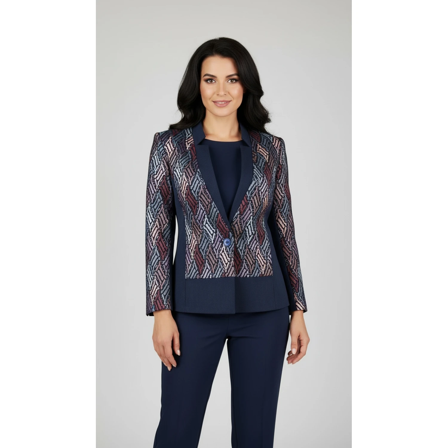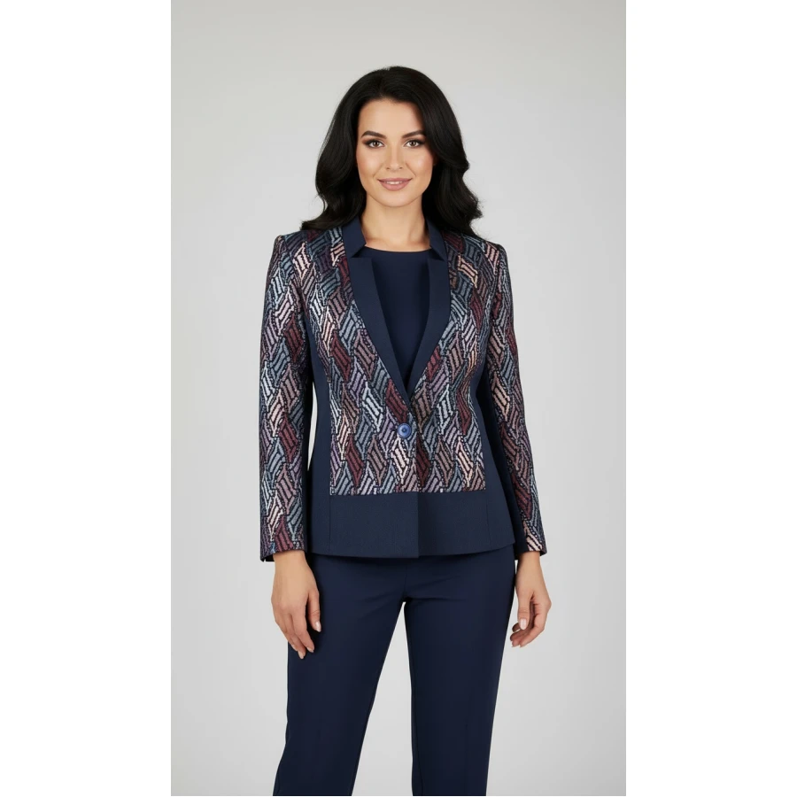 Пролетна Елегантност във Всеки Детайл: Подарете си едно наистина специално пролетно сако, което съчетава класическия тъмно син цвят с модерен блясък от лъскави нишки. Идеално за дамите, които обичат да се отличават.