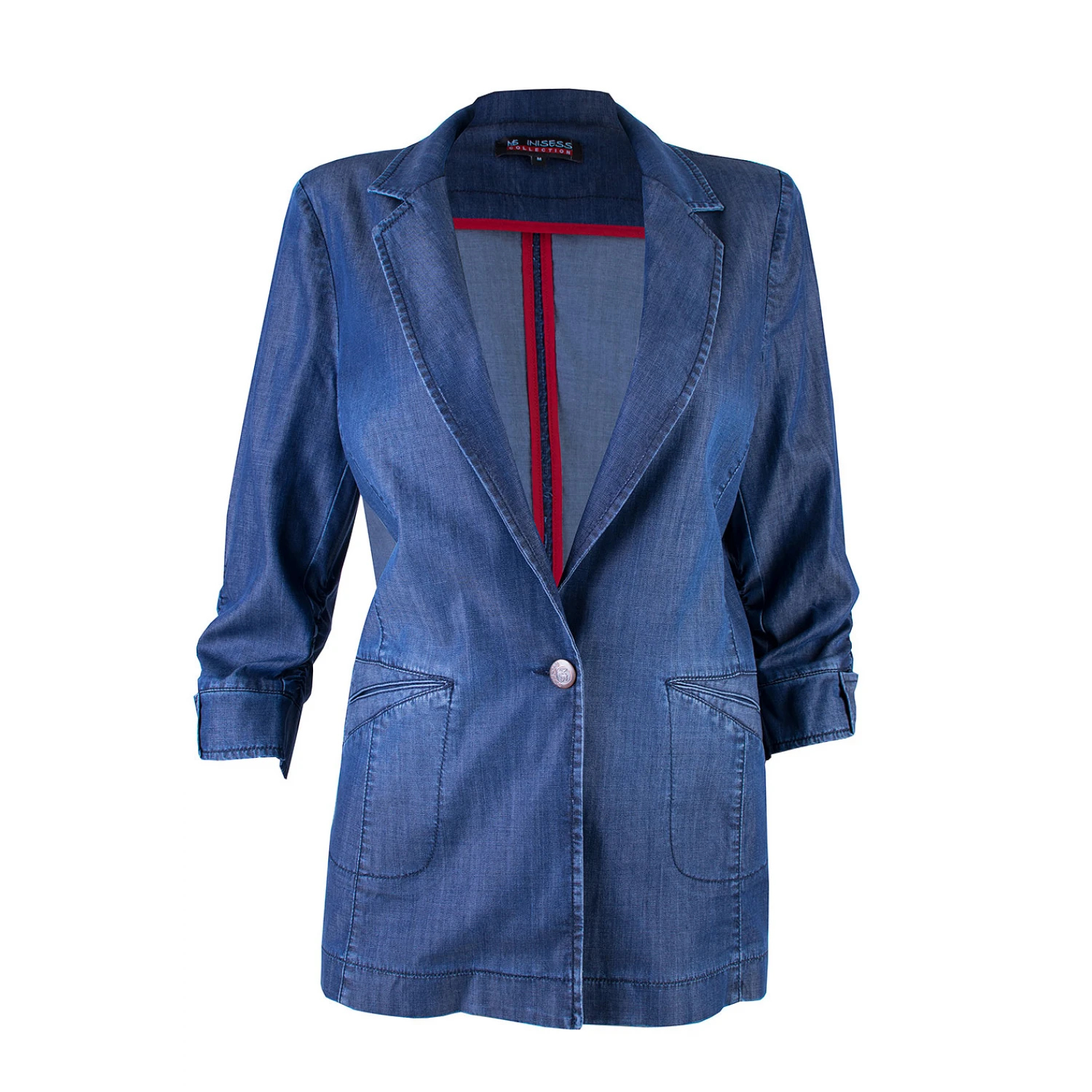 Това тънко дънково сако съчетава елегантност и комфорт благодарение на иновативната тенсел материя с добавен еластан. Силуетът е класически, с ревер и закопчаване с едно копче, а ръкавите са 3/4 с модерен детайл на маншета. Изключително подходящо както за ежедневни, така и за по-елегантни визии.