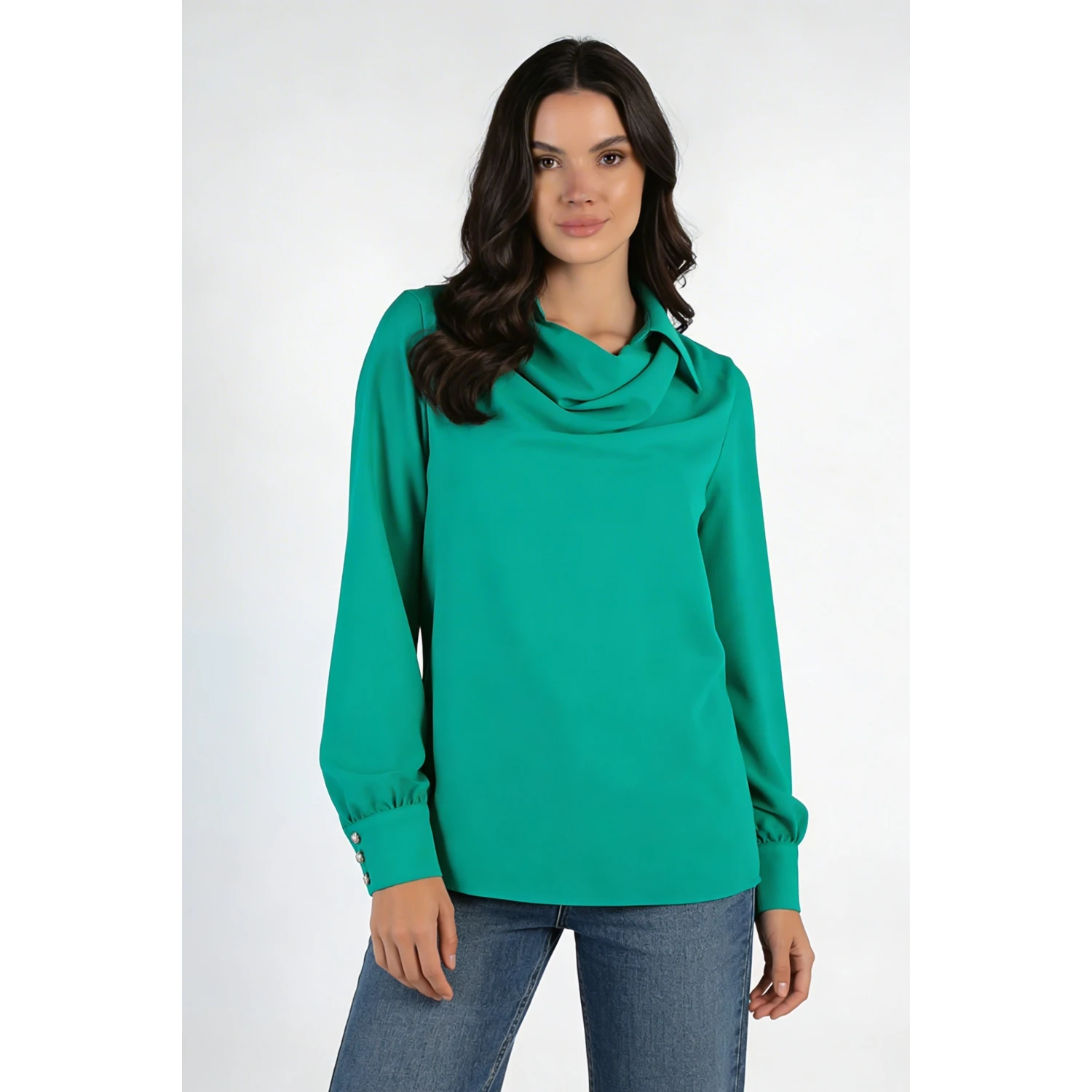 Yeşil renkli bu şık bluz ile özgürlüğü, rahatlığı ve çekiciliği garantileyeceksiniz. Sizi hem iş ortamında hem de açık kentsel alanlarda karşı konulmaz kılacak bu giysi ile saf kadınlığınızı vurgulayın. Uzun kollu, manşetle tamamlanan büyüleyici bluz, hafif, dokunuşu hoş kumaştan yapılmıştır. Büzgülü efektli, zarif yakalı ve şık görünümlü dekoratif bir sete sahiptir. Bol siluetli ve standart uzunluktaki bluz, hem bol hem de içe gizlenmiş olarak giyilebilir.