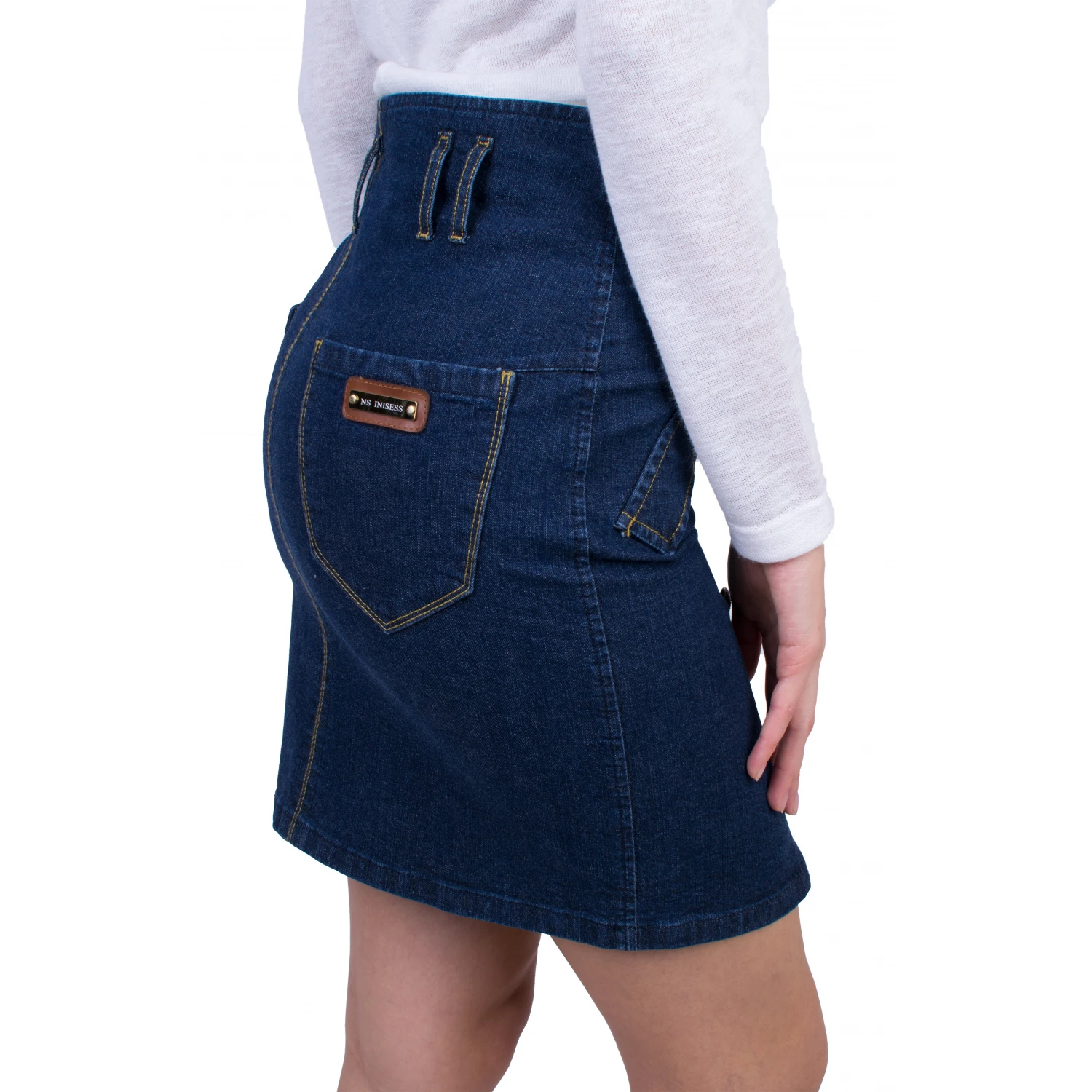 Bu yüksek belli, diz boyu kot etekle iyi eğlenceler. Metal saplamalara, dekoratif asimetrik kapaklara ve geniş kayış somunlarına sahiptir. Eteğin iki arka V cebi ve firmamızın logolu deri etiketi vardır.