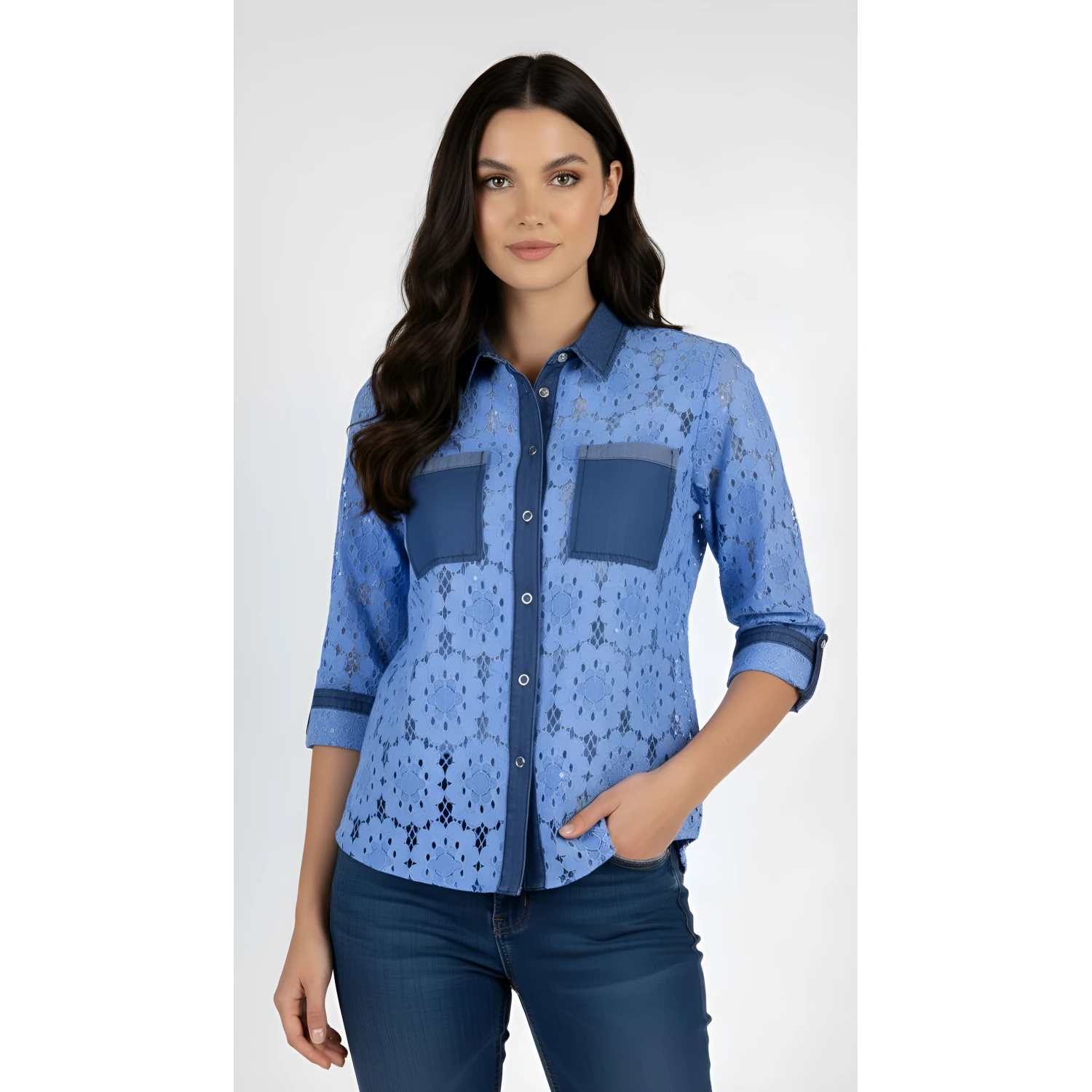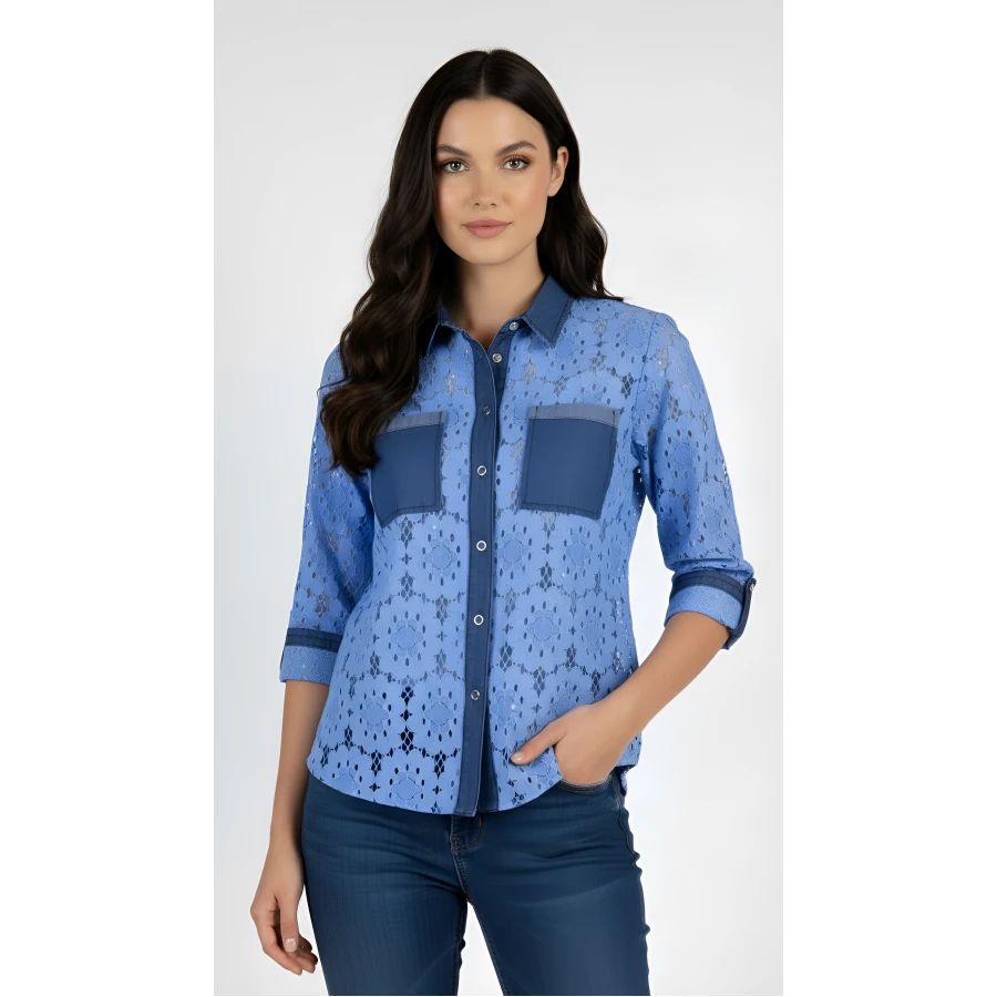 Dantel gömleğimizin yumuşaklığını ve rahatlığını tencel ve nötr payet kombinasyonuyla yaşayın. Bu gömlek %93 pamuk ve %7 elastandan üretilmiş olup gün boyu hafiflik ve rahatlık sağlar. Temiz sırt kısmı ve tic-tac düğme iliklemesi ile gündelik geziler veya daha özel günler için idealdir. Mavi pamuklu dantel sofistike bir görünüm katarken, nötr payetler kot pantolon veya diğer kıyafetlerle kolayca eşleştirilebilen hafif bir ışıltı katıyor.