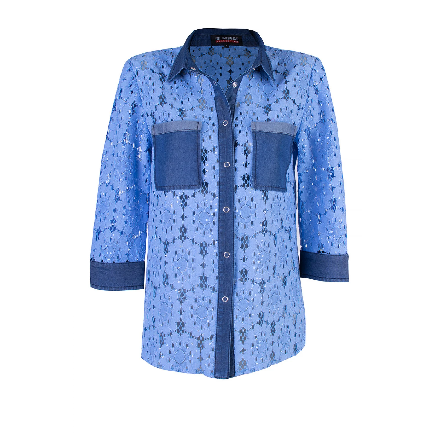 Lüks Kadın Mavi Pamuklu Dantel Gömlek Tencel